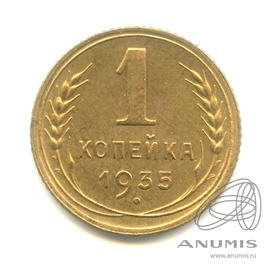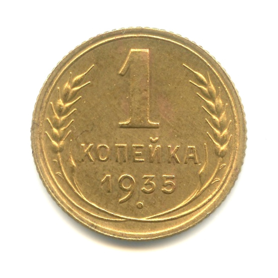 Монета регулярного выпуска: 1 копейка 1935 года «Без круговой надписи. Венок 7 лент». 1 копейка 1935 — 1936 гг. Союз Советских Социалистических Республик: СССР ранний (1924 — 1958). Бронза, 1 г, ø 15 мм, Гурт: Рубчатый. Тираж: 66405000(ст.инов.тип) шт.